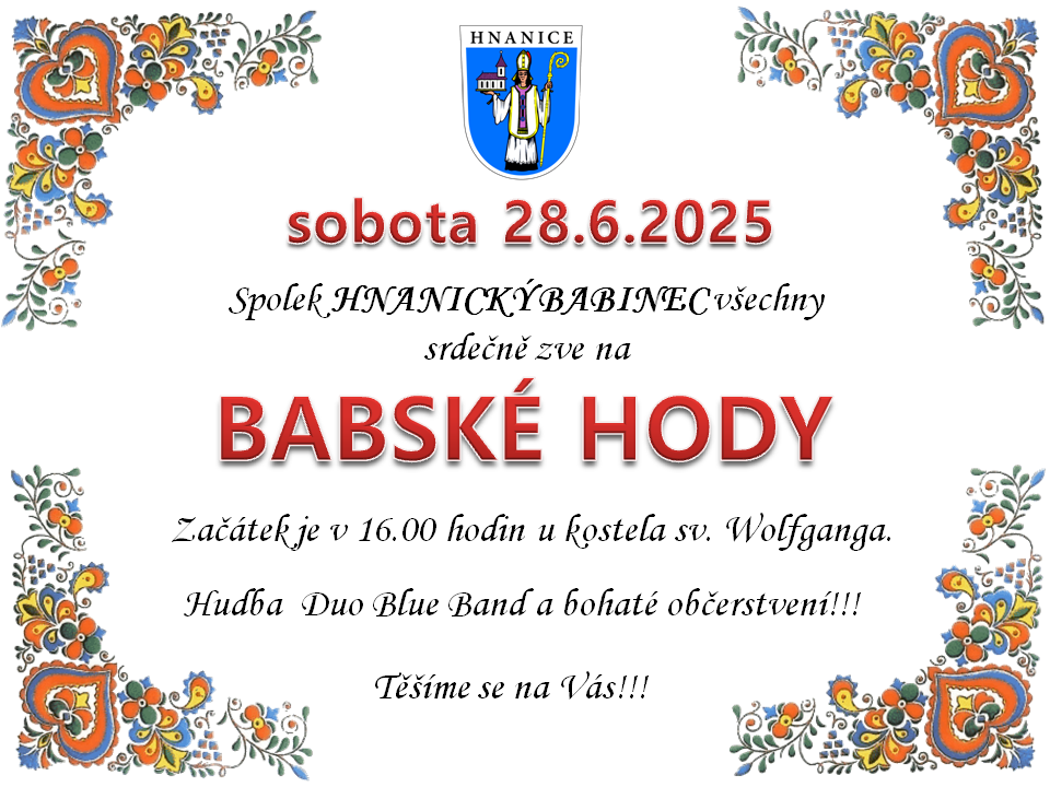 V sobotu 28.6.2025 spolek Hnanický Babinec všechny srdečně zve na tradiční BABSKÉ HODY. Začátek je v 16.00 hodin u kostela sv. Wolfganga. V případě nepříznivého počasí se program uskuteční v kulturním domě. O hudební doprovod se postará Duo Blue Band. Občerstvení zajištěno, vstupné dobrovolné.